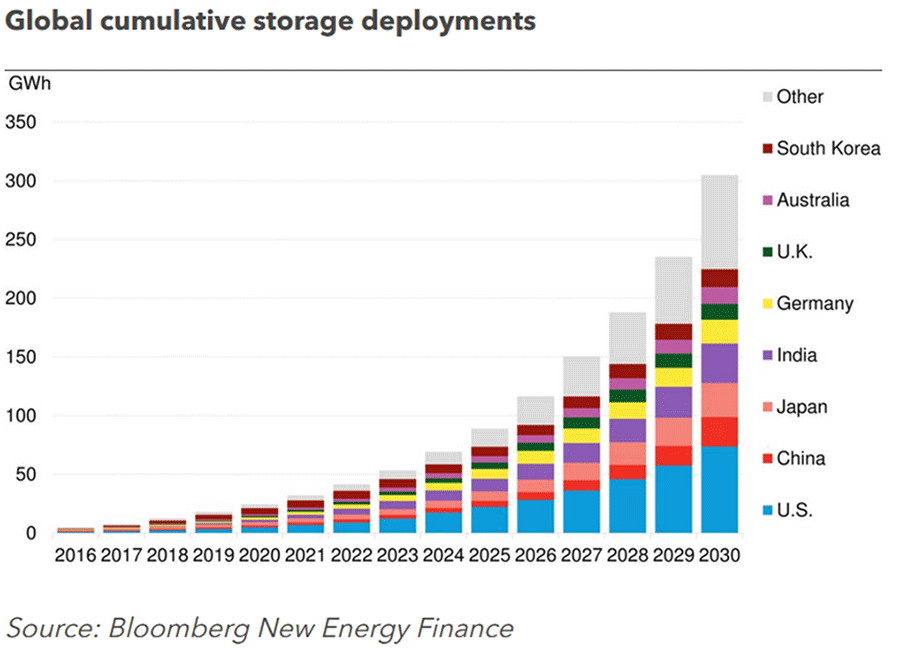 The global energy-storage market is growing very rapidly and will continue to do so. BloombergNEF forecasts around 350 GW of storage installed by 2030, while Wood Mackenzie forecasts nearly one terawatt-hour by the same year.